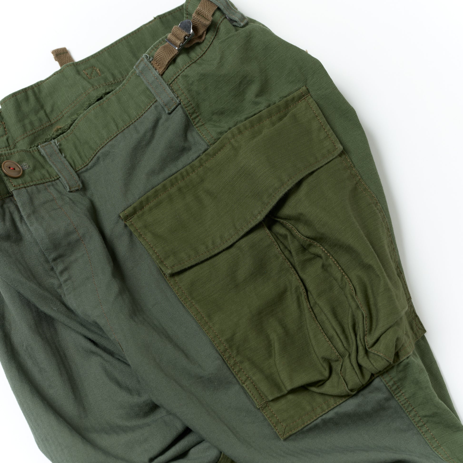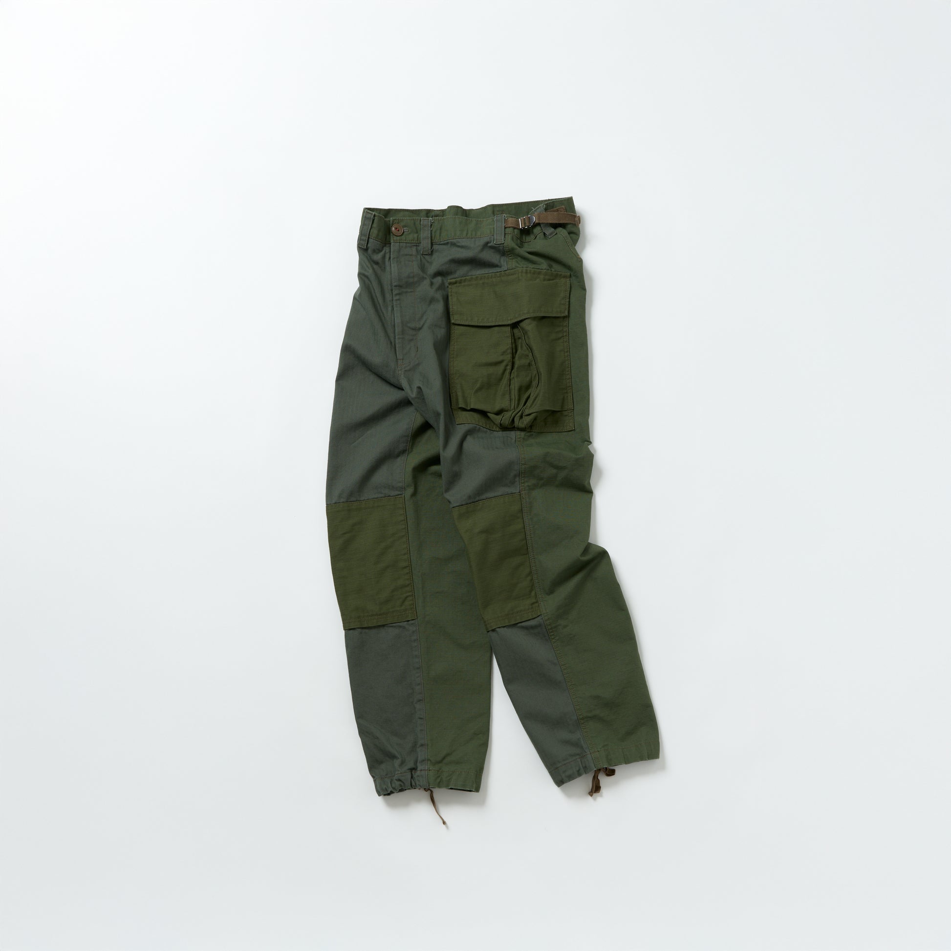 前見頃にヘリンボーンツイル、後ろ見頃とベルトにはジャングルファティーグリップストップ、ポケットと膝にバックサテン。全て綿100%の組成で、高い耐久性と耐摩耗性があります。またスレン染めで作られた生地なので、堅牢度が高く色落ちなどの経年変化も長期間にわたって楽しめるので、長く着用するのにも最適な生地の組み合わせとなります。