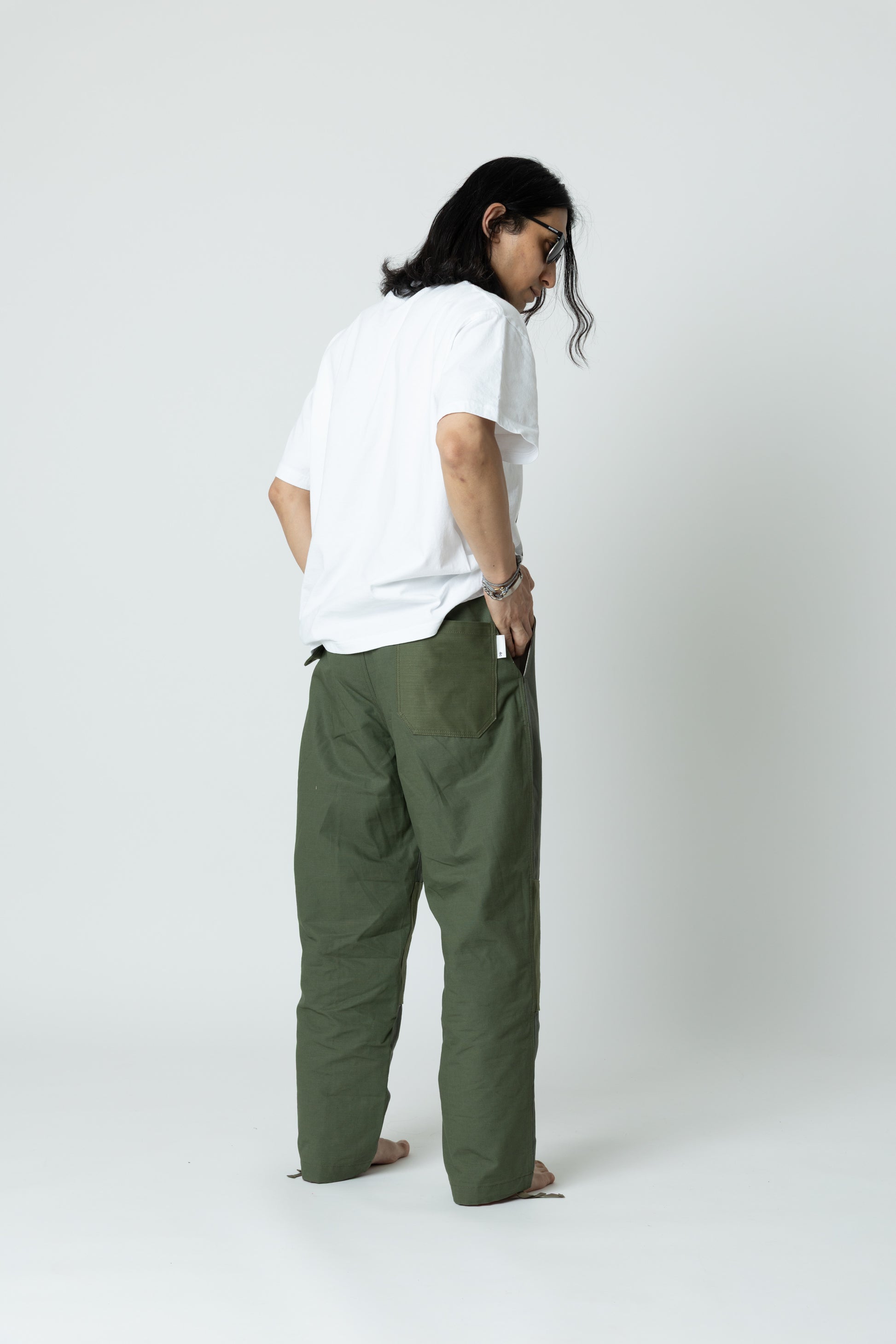 その中から象徴的なウェアの一つであり、また今日のファッションにおいても様々な形でデザインされている「カーゴパンツ」を再解釈することから始めた。